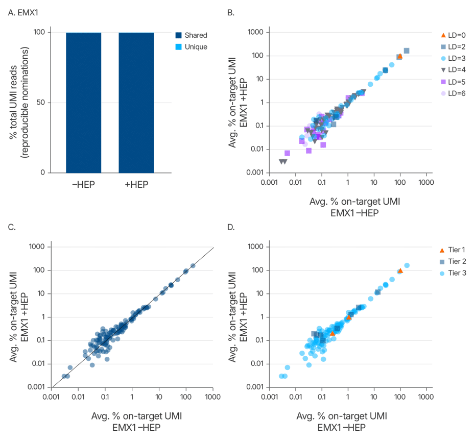 Maintaining editing specificity is critical for genome editing applications. To further evaluate whether the Alt-R HDR Enhancer Protein alters Cas9 off-target editing, we conducted an unbiased genome-wide off-target analysis using UNCOVER-seq in HEK293 cells stably expressing Cas9. Cells were treated with a guide RNA targeting the EMX1 locus and co-delivered with or without the enhancer protein. Off-target profiles were assessed based on unique molecular identifiers (UMIs) and categorized by Levenshtein distance, read correlation, and a tiered classification system that reflects predicted biological impact.